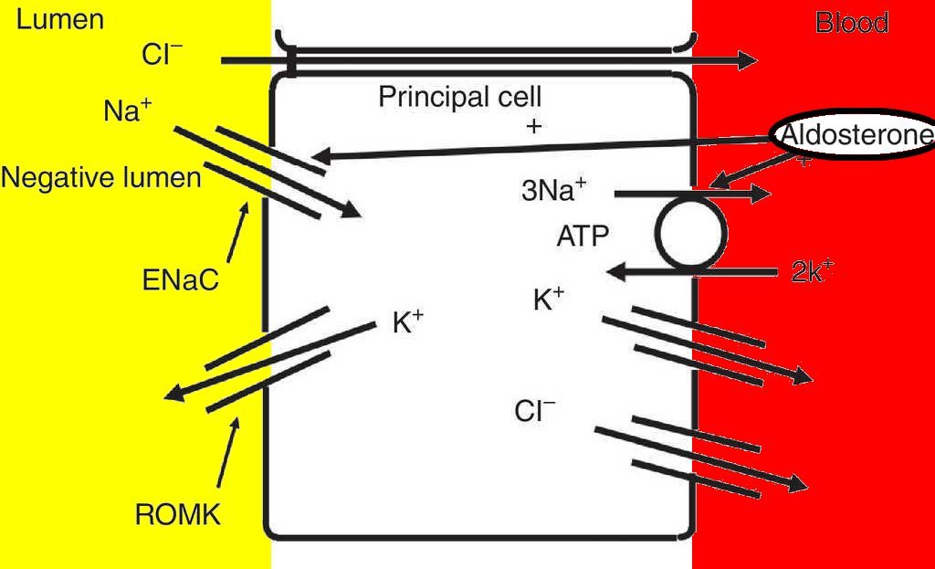 Aldostérone ➡️ expression de ENaC ➡️ réabsorption de Na+ ➡️ lumière urinaire plus électronégative ➡️ fuite du K+ vers les urines via ROMK.