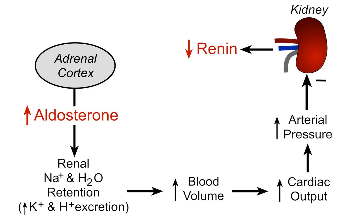 Dans ce cas, la contre-régulation adaptée, c'est que la rénine est ... BASSE⬇️(puisqu'on déborde d'aldo et de sel, plus besoin d'activer le SRAA via la rénine)