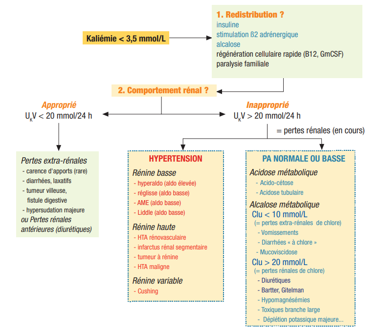 En préambule, retenez que le K+ est à 98% intracellulaire mais que sa concentration circulante est finement régulée parce que physiologiquement décisive (3.5-5 mmol/L).
