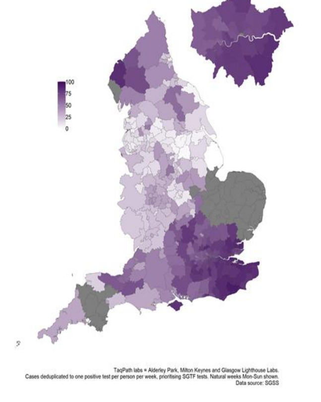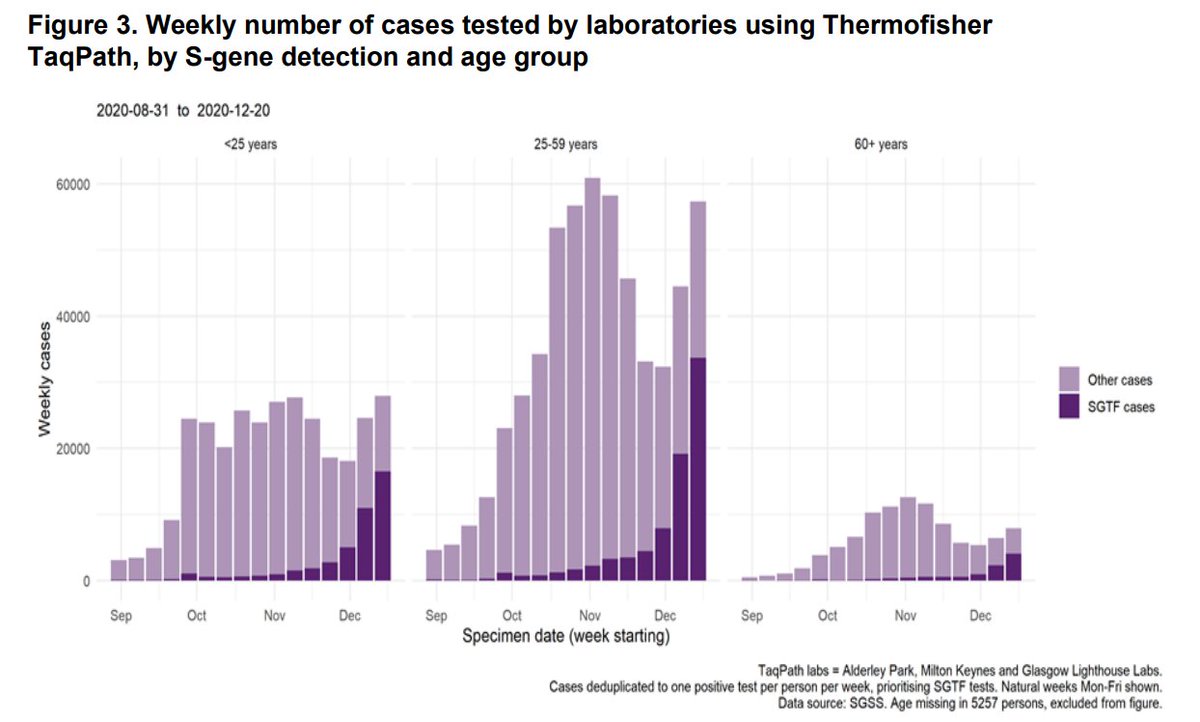 2/ B.1.1.7 has a deletion of 6 letters of RNA in the S gene, which happens to make one of the three PCR tests performed on each swab sample in the Lighthouse labs give a negative result. So these "S-negatives" can be a proxy for B.1.1.7.