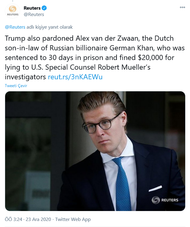 Trump'ın geçtiğimiz gün, ABD müfettişlerine yalan söylediği için 30 gün hapis ve 20.000 dolar para cezasına çarptırılan Rus milyarder German Han'ın damadı Alex van der Zwaan'ı da affettiğini duymuşsunuzdur. German Han, Rus Alfa Group'un kurucu ortaklarından.