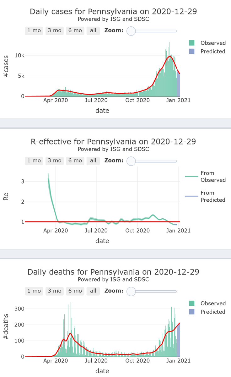 5/10 - Pennsylvania is slowly landing towards its #COVID19 safety zone (R-eff=0.86), at high levels, with increasing alarming levels of mortality, for 7 more days
