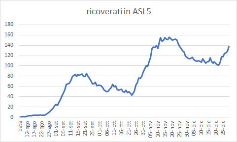 La situazione dei ricoverati a La Spezia è preoccupante: ho notizie di cluster nei reparti "puliti" e di circa 10 diagnosi fatte ai PS di ASL5 ogni giorno nell'ultima settimana (il picco a novembre fu 15 al giorno). Visivamente è in corso una terza fase della seconda ondata.