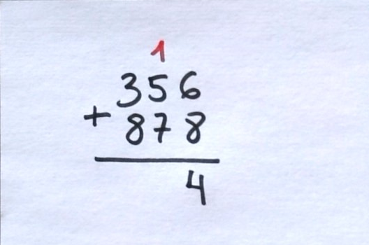 5. Si el resultado de la suma es mayor o igual que 10, escribe sus unidades en la columna actual y añade la cifra de las decenas a la suma de la columna siguiente. 6. Continúa el procedimiento (vuelve a paso 3) hasta llegar a la última columna.