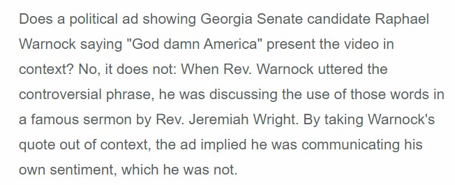 4. Here's Warnock's full quote: "Extracted from its theological and rhetorical context and looped to the point of ad nauseam was the most provocative phrase 'God Damn America'"