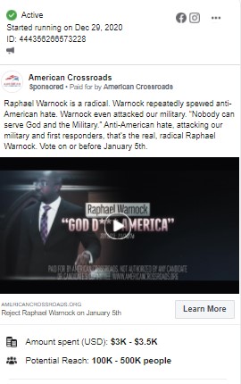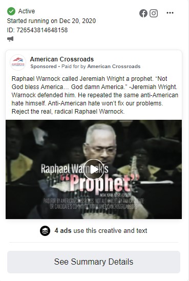 3. The American Crossroads ad tells Georgia voters on Facebook that Warnock said "God Damn America."