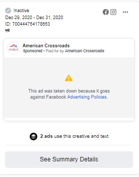 6. Several hours later, Facebook finally removed the ads for violating its policies. That is what they are supposed to do. Under Facebook's rules, politicians and parties can post false political ads but Super PACs cannot.