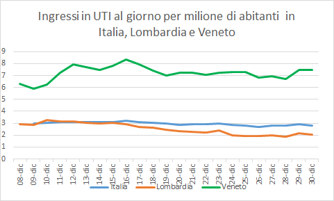 Pessimo è anche il dato degli ingressi UTI giornalieri notificati, che è stabile ma molto superiore alla media italiana o al dato della vicina Lombardia: