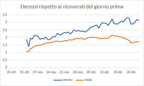 La cosa si spiega semplicemente con la presenza di molta più malattia in Veneto rispetto al resto del paese, con conseguente sovraccarico degli ospedali che non ricoverano quanto altrove.