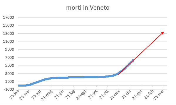 Procedendo così (90 decessi al giorno) il Veneto avrà circa ulteriori 6-7mila morti prima di fine marzo, quando si spera che inizierà a sentirsi l'effetto della vaccinazione degli anziani.