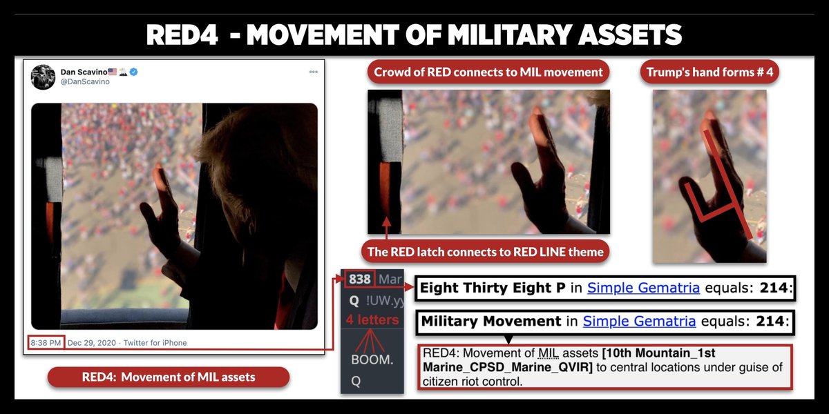 Algunos opinan (en base a interpretación por gematría) que la imagen del Presidente Trump saludando a la multitud, de camisetas rojas, publicada ayer por Scavino señala el movimiento "Red4" (movimientos militares) de la serie de 6, porque está haciendo un "cuatro" con la mano.