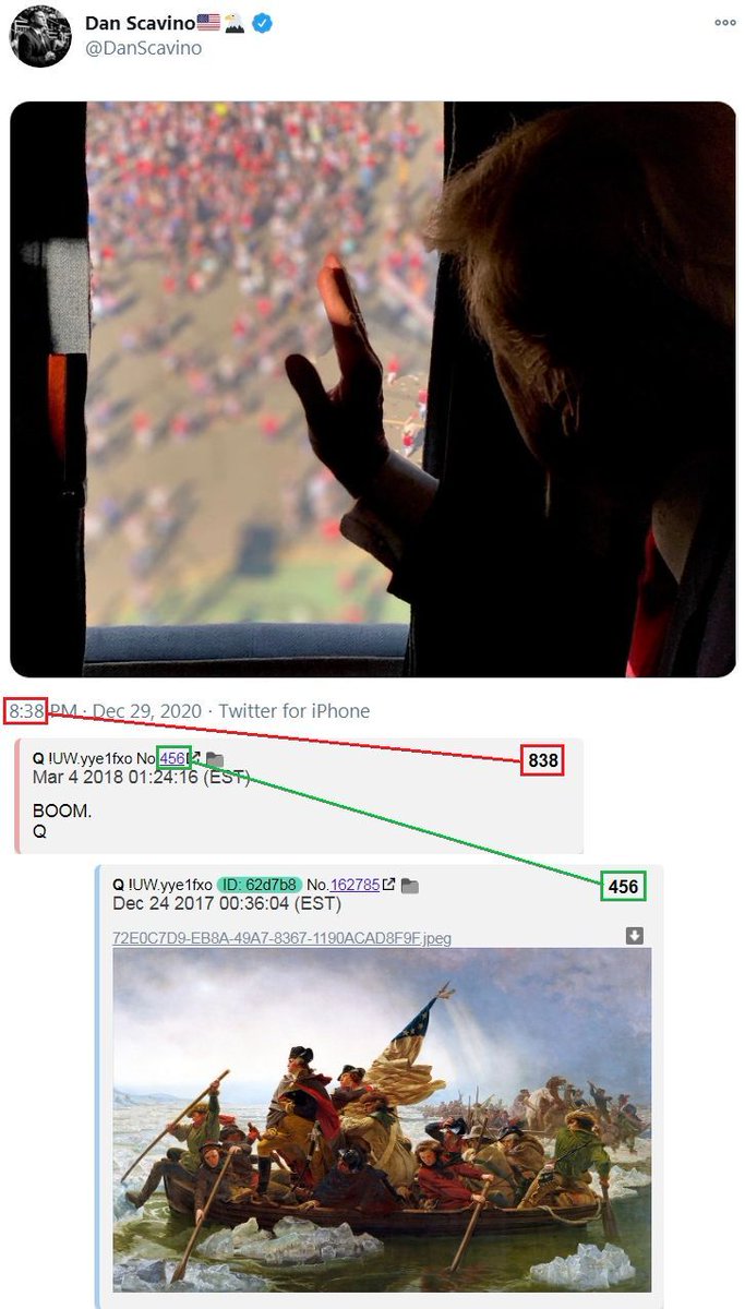 El jefe de redes sociales del Presidente ha publicado a las 8:38 horas una fotografía de Donald Trump que lleva a la publicación 838 de Q, que conecta, con otro código ("boom"), con el famoso cuadro de George Washington cruzando el río Delaware que significó, como sabéis,