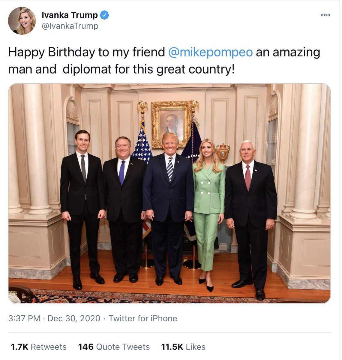 Ayer el Presidente Trump tuiteó una foto celebrando el cumpleaños del secretario de estado, Pompeo, junto con su hija Ivanka y su yerno ¡y el vicepresidente Pence! sobre el que recae la responsabilidad de detener el fraude electoral dentro de 6 días.