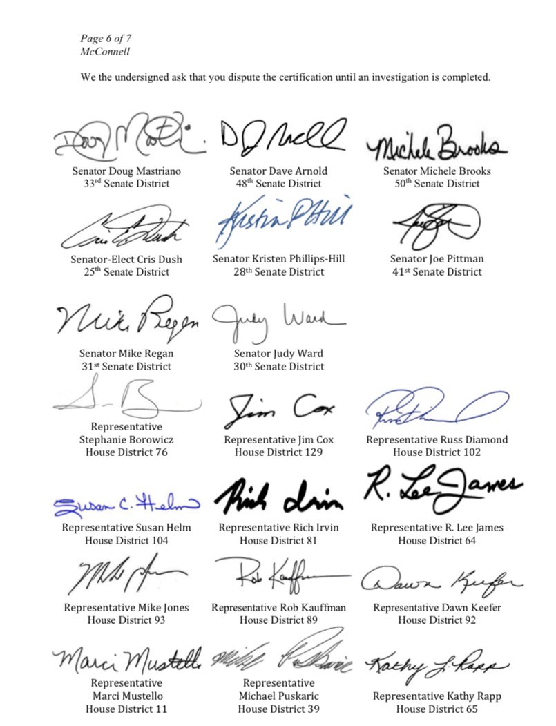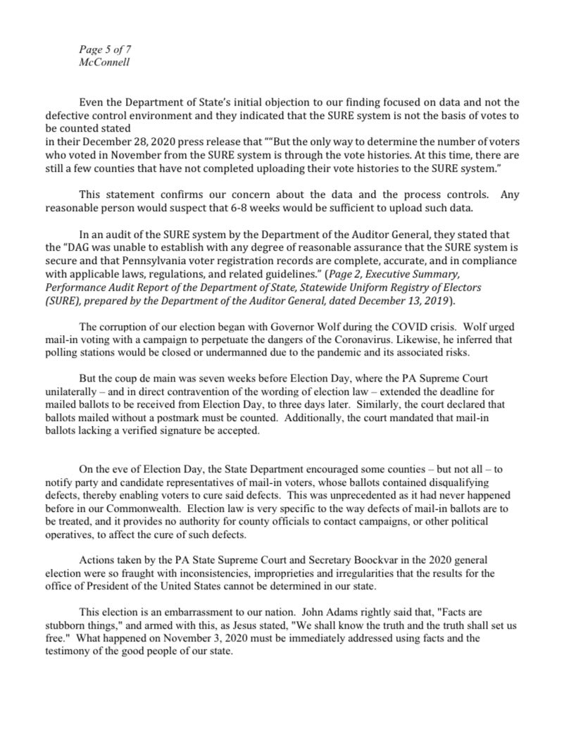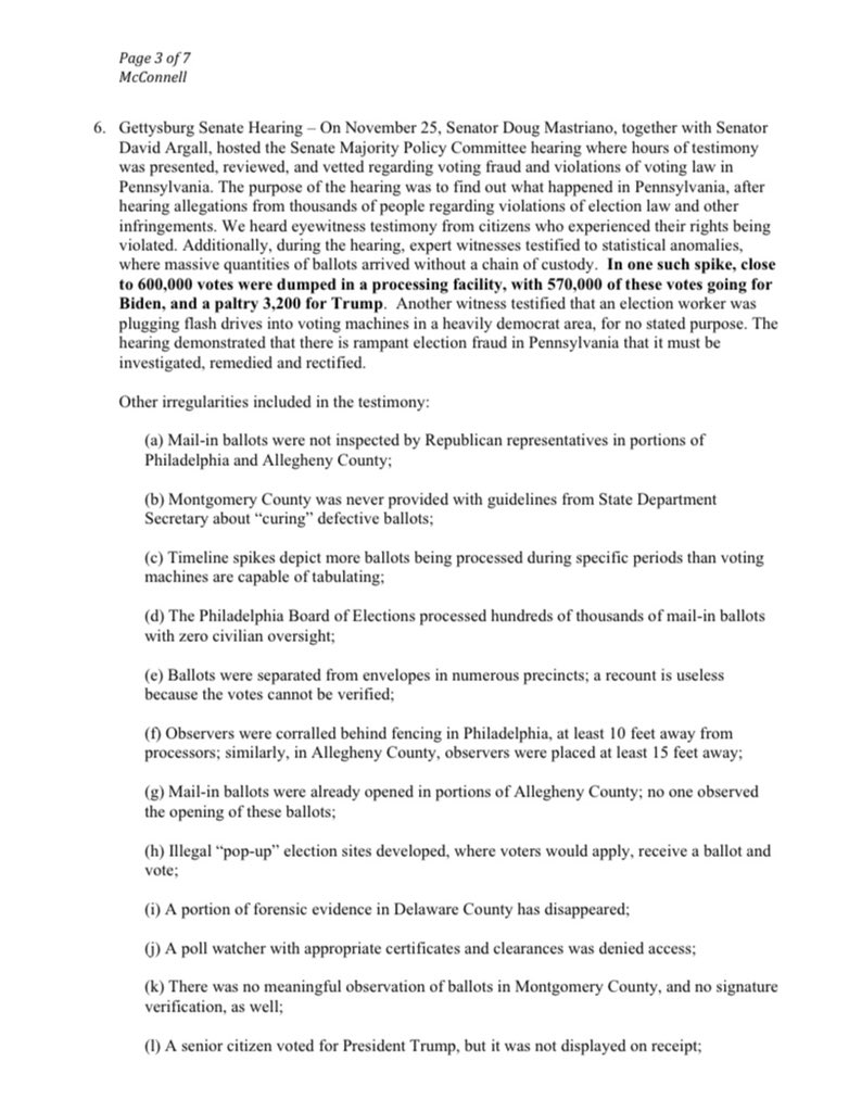 Today, members of the PA House and Senate request that Sen Mitch McConnell and Rep Kevin McCarthy dispute the PA election results until an investigation is conducted into the numerous claims of fraud. Until this is completed, the hastily certified results can’t be trusted (pt 1)