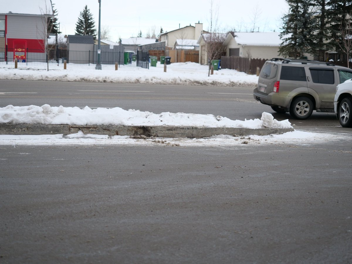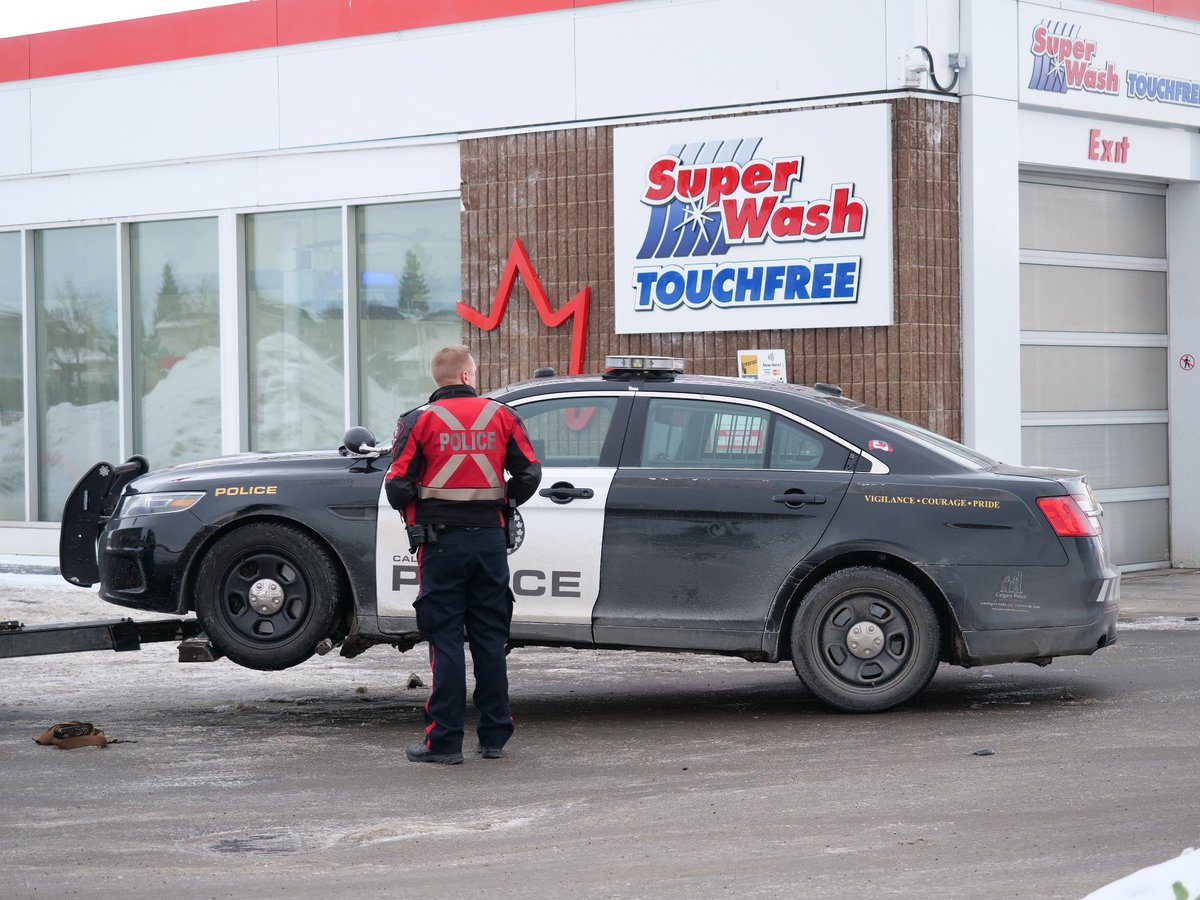 I'm at the scene in Falconridge where a Calgary police officer was killed during a traffic stop late last night. Arrived as they were towing away his squad car. A single white rose lies on a snowbank in memory of Sgt. Andrew Harnett. #yyc