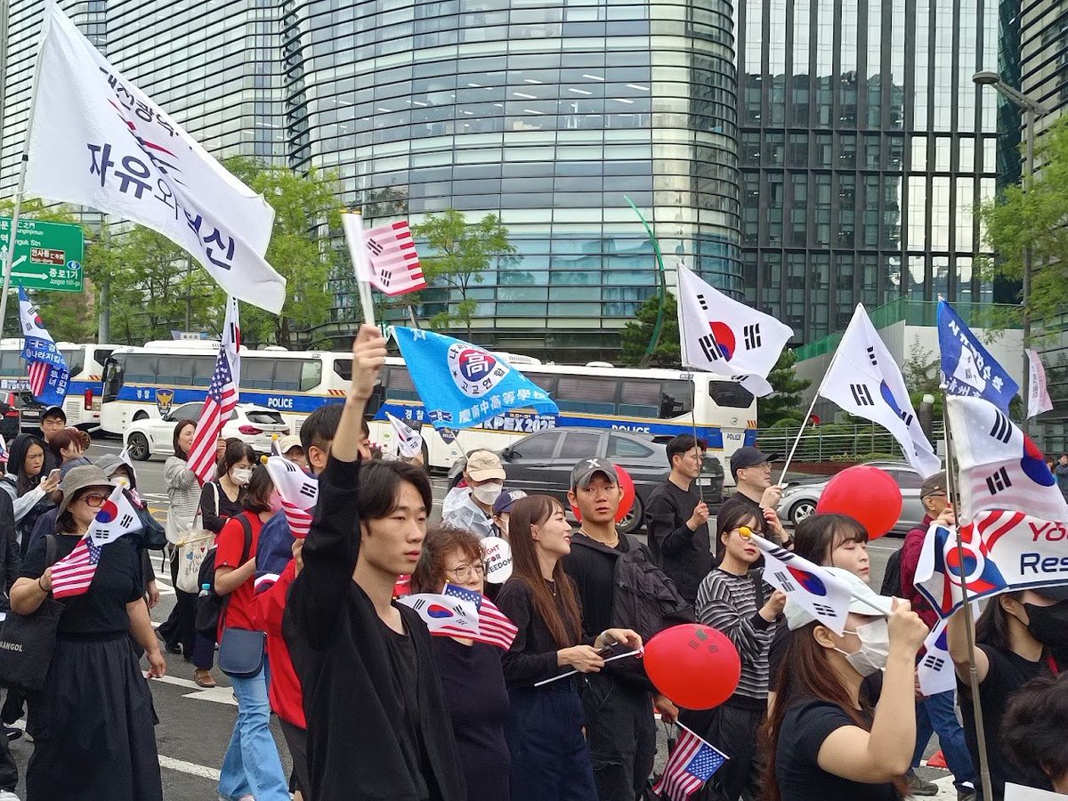 2/ Thousands gathered in the streets of Seoul today, singing racist chants to the effect of "chinks get the fuck out" and "Yoon is our president", waving "We are Charlie Kirk" balloons, massive "Stop the Steal" flags, US flags, "Korea for Koreans" slogans, and Christian symbols.