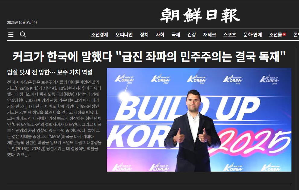 1/ Is Chosun Ilbo becoming a MAGA mouthpiece? Today, South Korea's biggest conservative paper made its top headline an essay deifying Charlie Kirk, complete with warnings about "radical-left dictatorships", framing the US-ROK alliance through shared Christian faith.