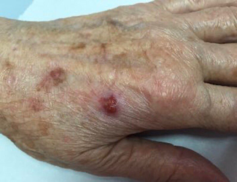 orejas, rostro, cuello, cuero cabelludo y manos, sobre piel dañada por el sol.