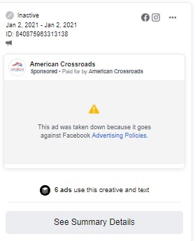 Facebook has taken down the same American Crossroads ad FOUR OTHER TIMES since December 17 -- 12/18, 12/20, 12/24, 12/31.