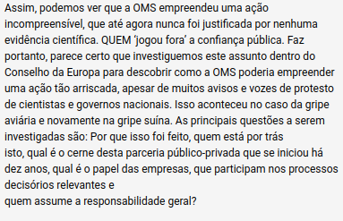 Entre os pontos semelhantes com o que estamos passando hoje, o Dr. Wolfgang Wodarg, medical expert specialising in epidemiology disse 2 coisa sobre vacinas