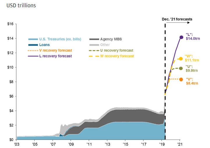 @jpmorgan estimated that the worst outcome - L-shape 'recovery' - could raise the Fed assets up to 14tr USD by the end of 2021
