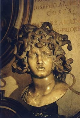 y esta diosa virgen, horrorizada por el sacrilegio, convirtió a la infortunada mortal en un ser monstruoso con serpientes por cabellos, a la que mató Perseo sin mirarla, ya que tenía el poder de convertir en piedra a quien la mirase de frente.