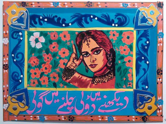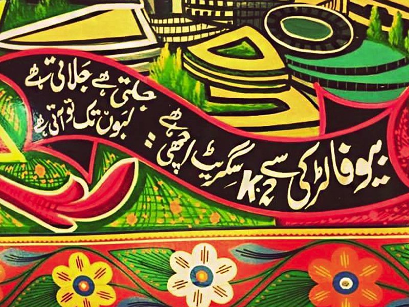 Poetry regarding heartbreak, wisdom, sufism and famous Pakistani cultural slangs, places and personalities are painted on the back and sides of the trucks.