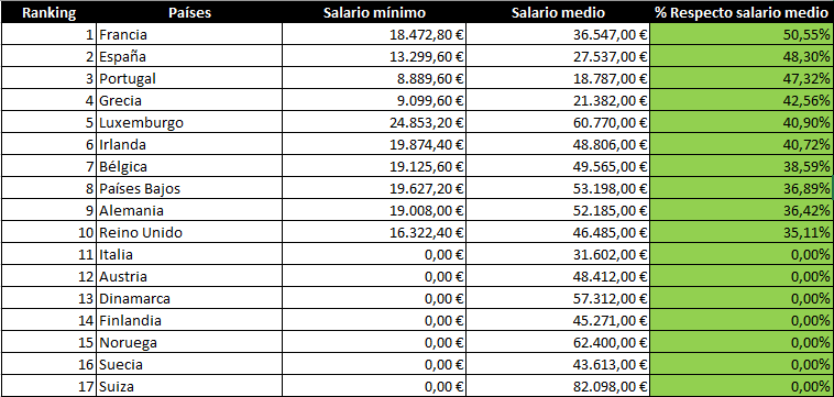 23)En España tenemos un SMI de 950€ mensuales en 14 pagas, es decir, de 13.300 euros anuales, algunos consideran que es relativamente bajo en comparación con otros países del entorno, ¿pero es realmente así? Pues parece que no si lo comparamos con el salario medio