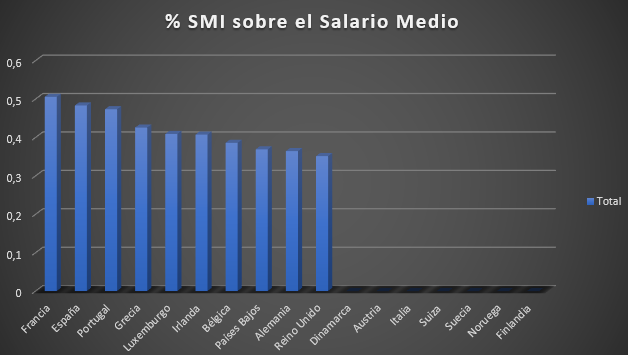 24)Como vemos en las gráficas, el SMI de España representa el 48,30% del Salario Medio del país, el segundo % más elevado tras Francia de los países analizados. Luxemburgo o Irlanda están en un 40% a pesar de tener salarios mínimos “altos”.