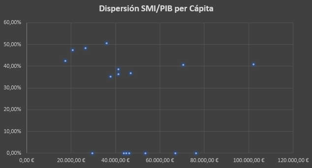 26)Y esto se aprecia mejor con un gráfico de dispersión, vemos como los países con el SMI más elevado son los que tienen una economía más débil, sin embargo, hay excepciones como Luxemburgo o Irlanda, y esto es, porque como he dicho al principio, un SMI por si solo puede