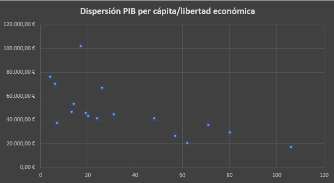 40)Si observamos el gráfico de dispersión de los países analizados, apreciamos que los que ocupan un puesto más alto en libertad económica, son más prósperos económicamente y tienen los mejores niveles de empleo y condiciones salariales.