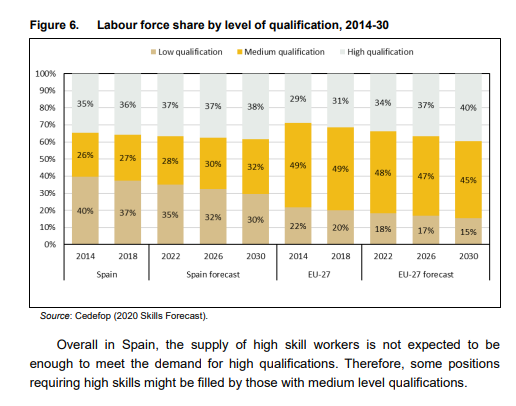 36)Y esto fue uno los puntos que criticó la CEDEFOP en su informe sobre España, podemos apreciar como el nivel de empleados disponibles con baja cualificación alcanzó el 37% en 2018, frente a la media de la UE que se sitúa en torno al 20%.