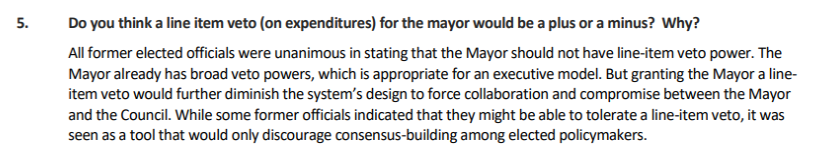 None of the former elected officials like the idea of giving the mayor a line item veto, which is something the Charter Commission's work group is considering