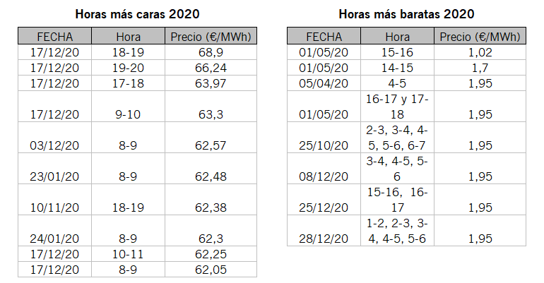 Algunos datos de los meses, días, y horas más caros y baratos de 2020. Y precios promedios, máximos y mínimos de las 24 horas del día #ingestats