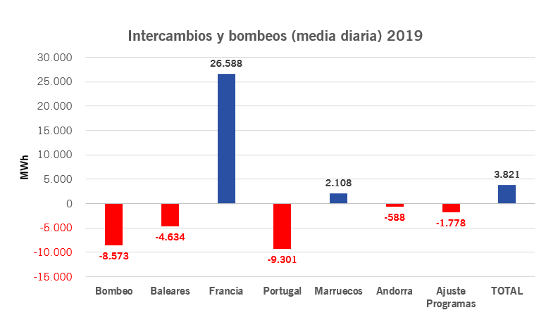 Unos datos de media diaria de generación y demanda estos dos últimos años (peninsular). Añadimos también los intercambios internacionales y nacionales (diferencia entre generación y demanda junto con los bombeos para ambos años #ingestats