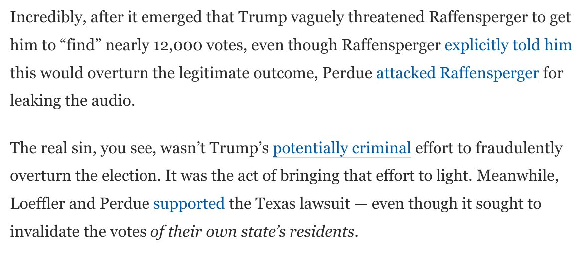 This keeps getting lost in euphemism. But Kelly Loeffler and David Perdue are waging full-scale war *on their own state's voters.* If they win, this will be validated as just another tool of political mobilization. That's awful to contemplate. My latest: washingtonpost.com/opinions/2021/…