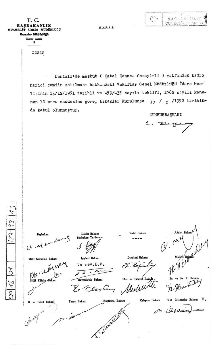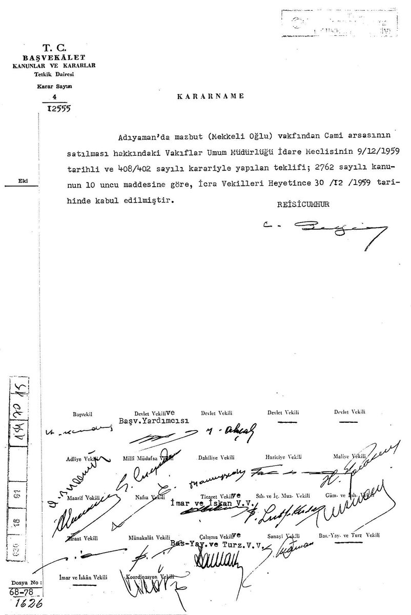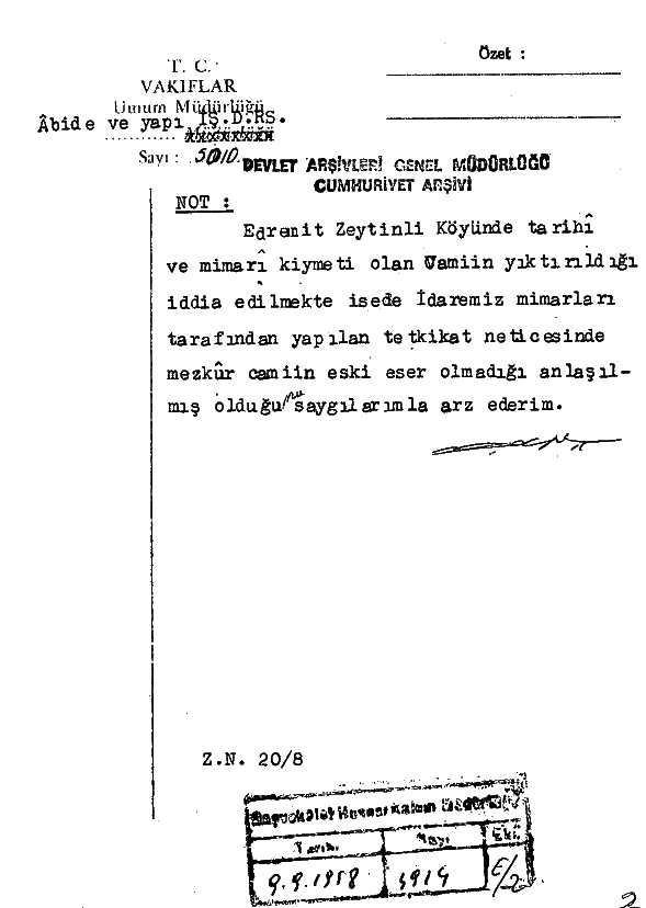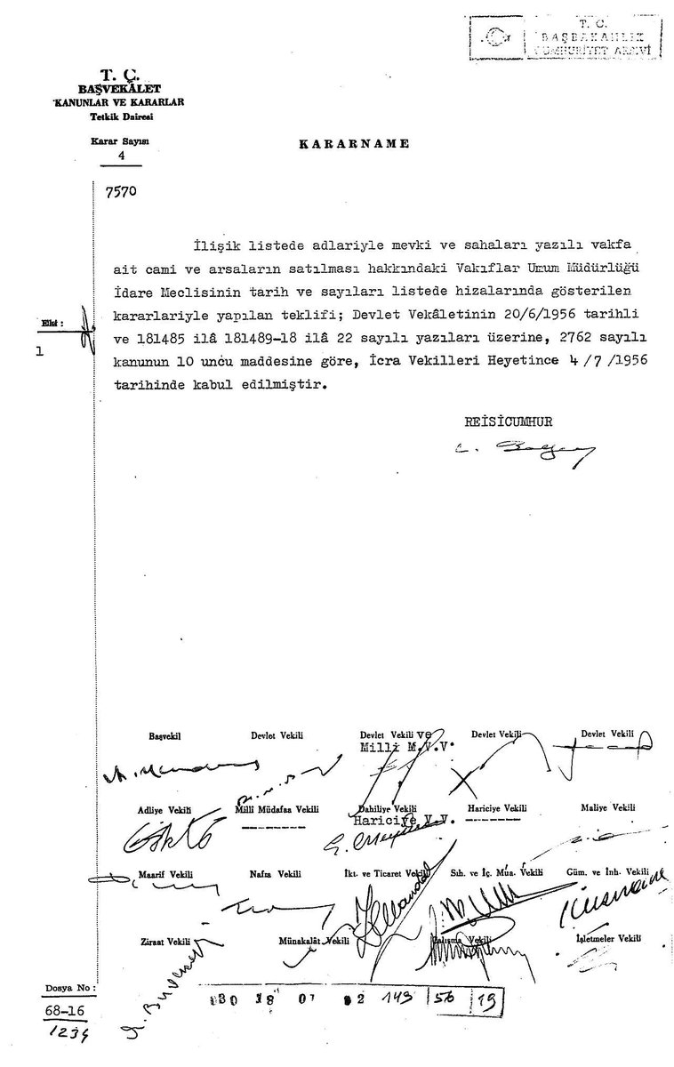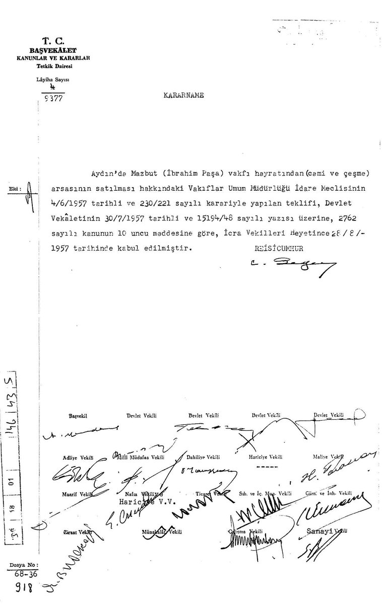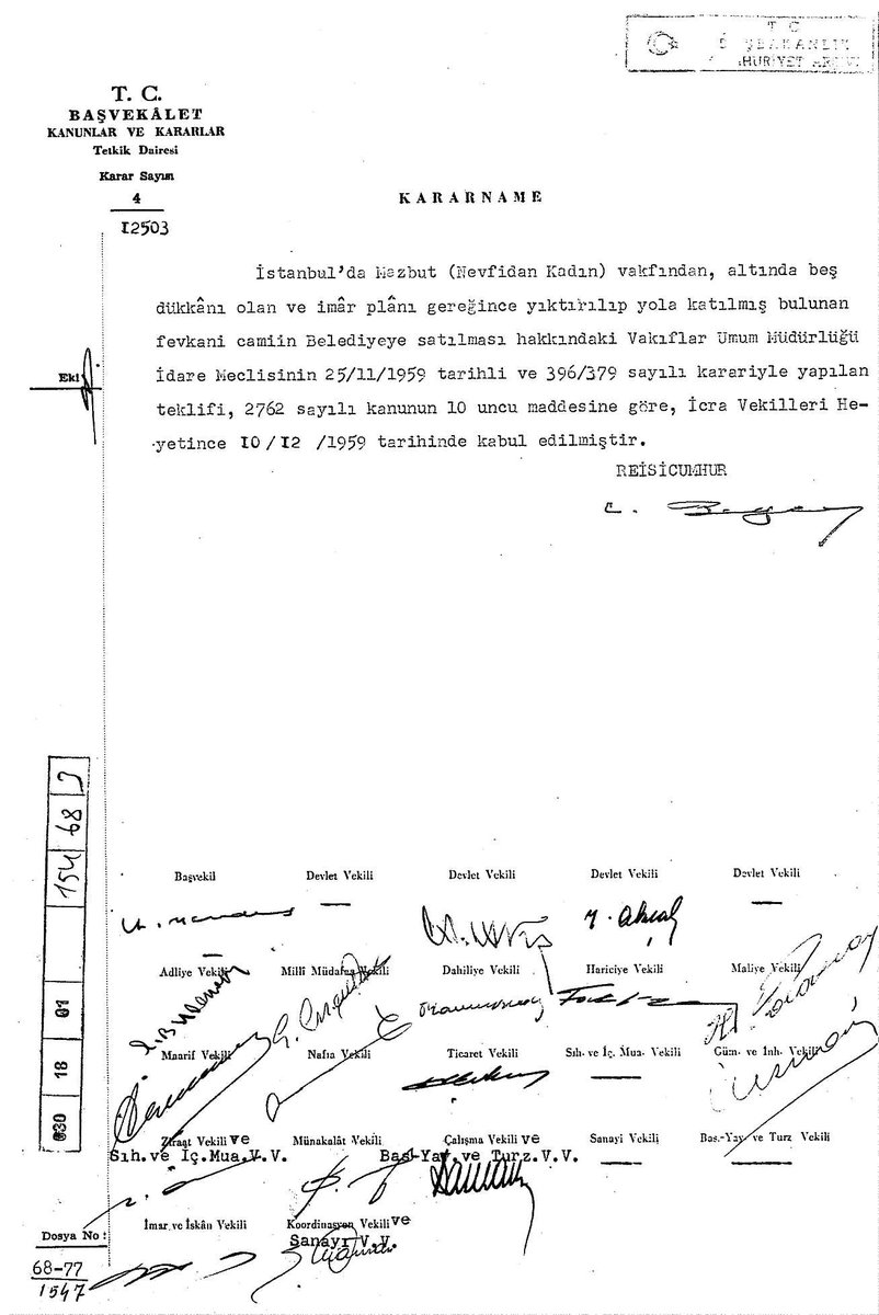 Nevfidan Kadın Vakfı'na ait bir caminin imar faaliyetleri kapsamında yıktırılıp yola dahil edildiği ve belediyeye satıldığına dair arşiv belgesi.
