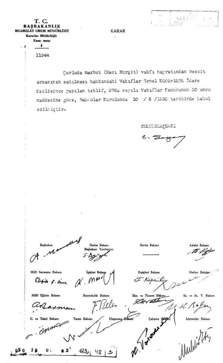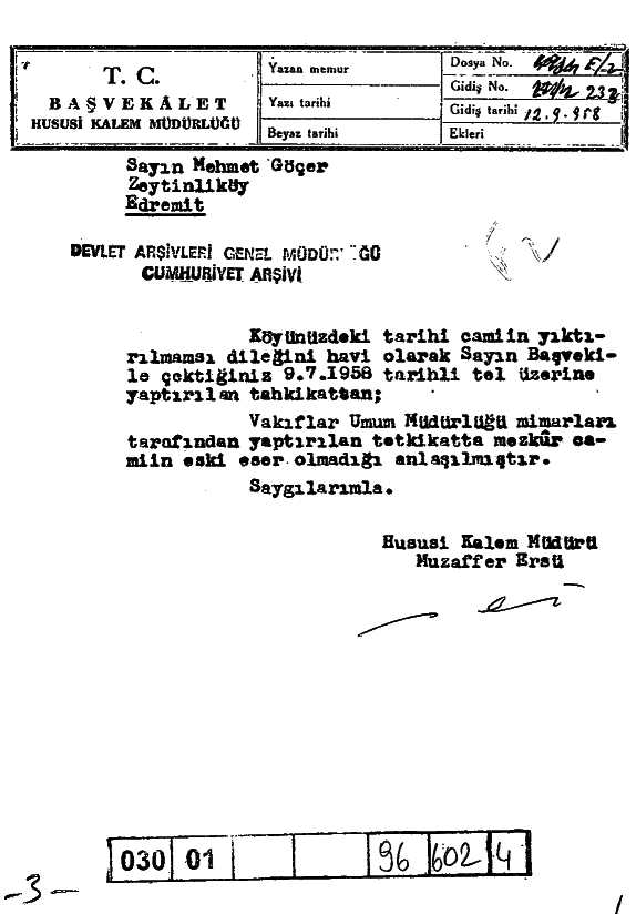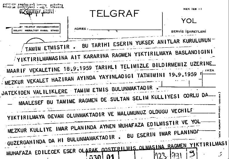 Aşağıdaki belge de mimarlar, Çorlu'da Mimar Sinan eseri olan cami ve külliyenin yol güzergahında olmamasına rağmen yıktırılmasını şikayet ediyorlar.