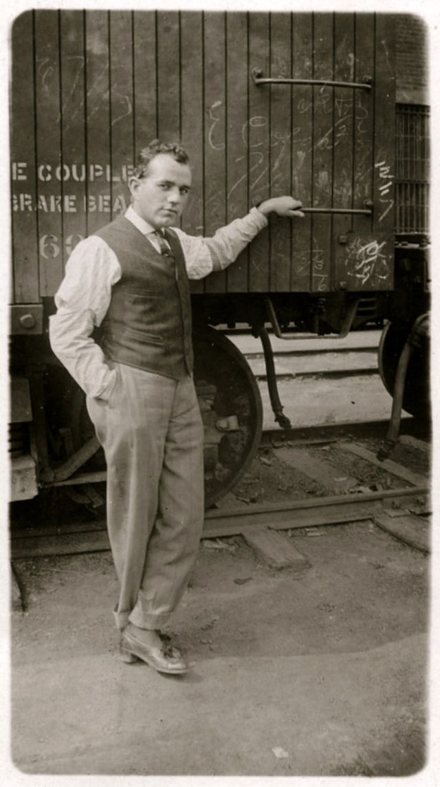 3. An expressive color photo of author F. Scott Fitzgerald. He's got a knit tie and what looks like a thick wool suit.