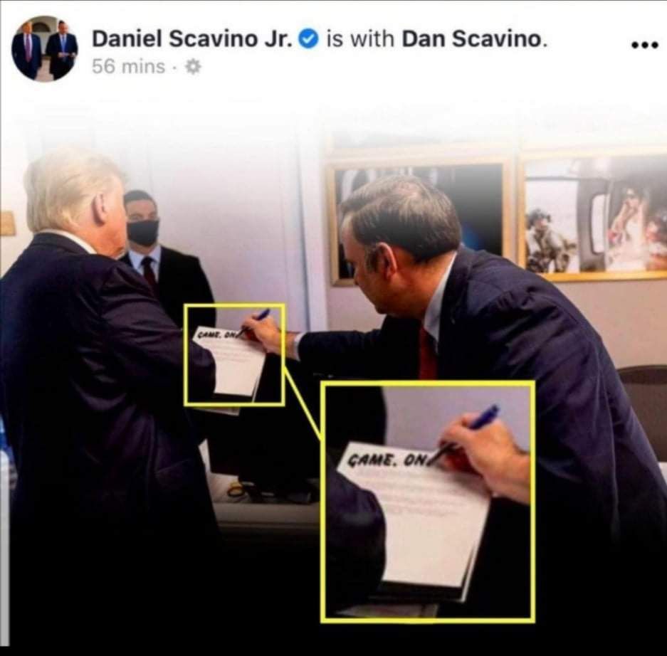 El jefe de redes sociales del Presidente, Dan Scavino, ha publicado una imagen ayer que continúa la secuencia "sir. GAME. ON". En este caso, alguien del equipo de Trump escribe la palabra "ON" al lado de "GAME" como