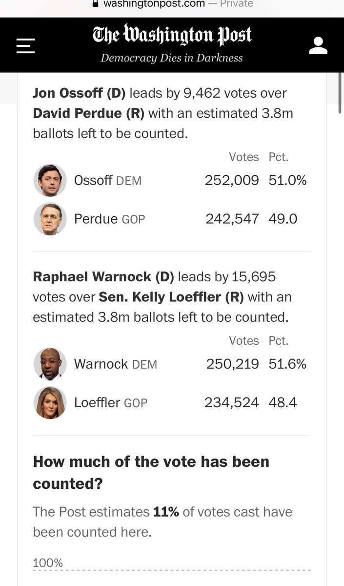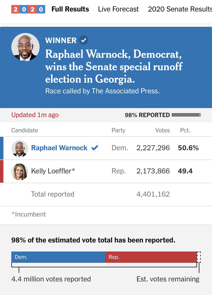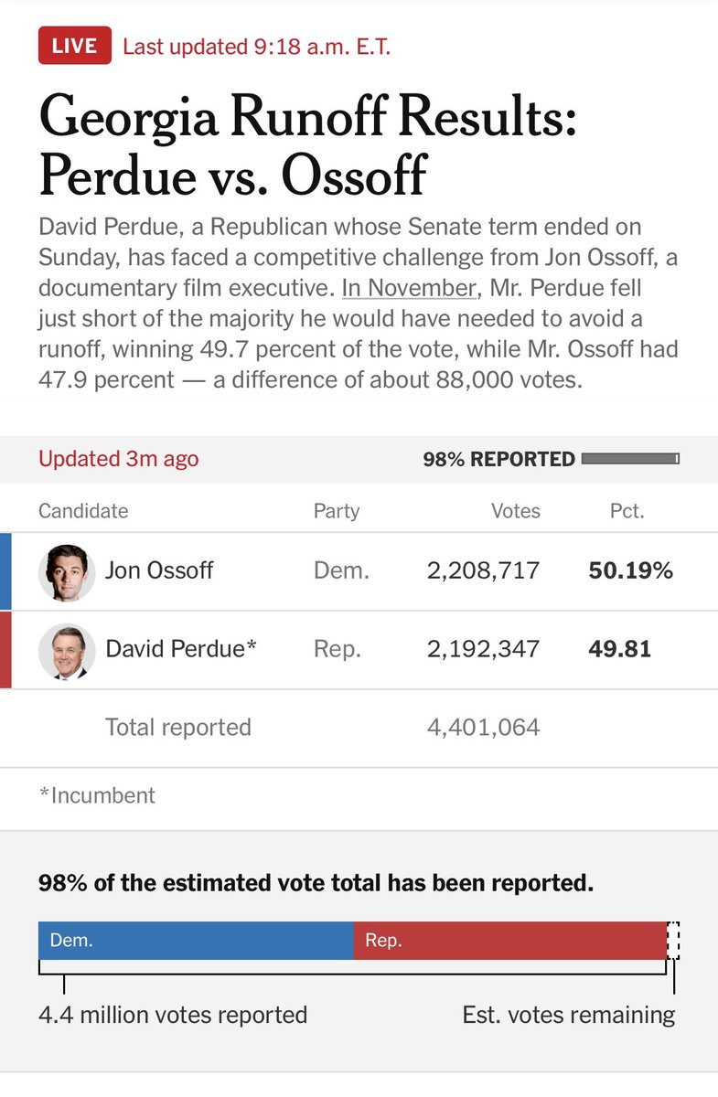 Good morning from DC! I awoke to learn the @ap called the race for Senator-Elect @ReverendWarnock: nytimes.com/interactive/20…@ossoff leads by 16,773 votes (less than the 0.5% required for @sendavidperdue to request a recount). Race has not been called, but Ossoff declared victory.