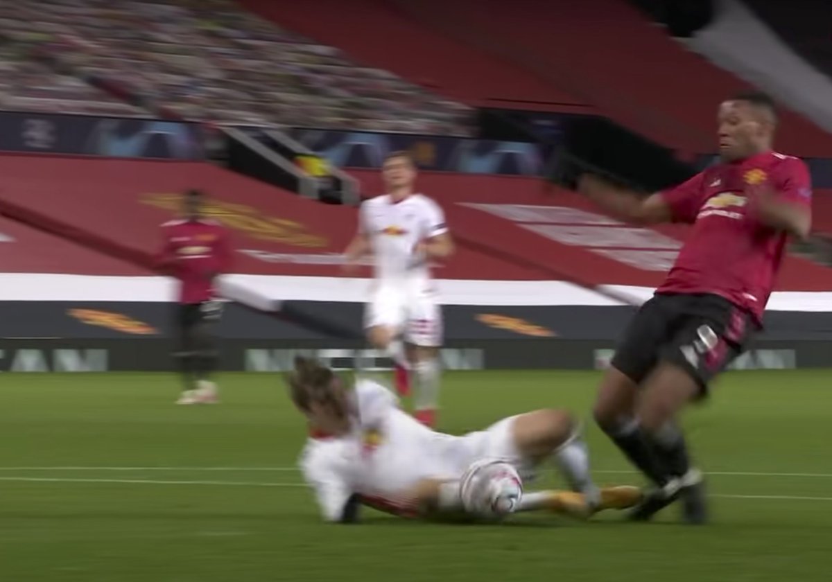although it didn't affect the outcome, a clear dive by Martial to get the penalty. He was going down even before there was contact. The pic below shows Martial clearly going down before coming into contact with the Leipzig player.
