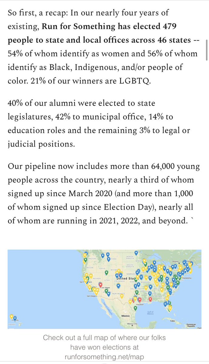 The @runforsomething candidate pipeline grew from 45,000 at the beginning of the year to now 65,000+ young people who’ve said they want to run for office (and 2000+ of those folks have signed up since Election Day 2020!!!) /2