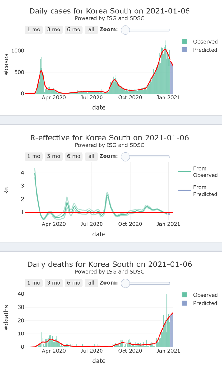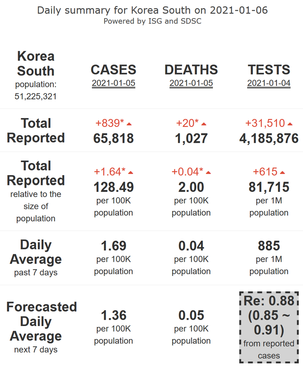 17/21. South Korea will remain in its #COVID19 safety zone (with <800 cases/day, R-eff=0.88), and low levels of mortality, for 7 more days.
