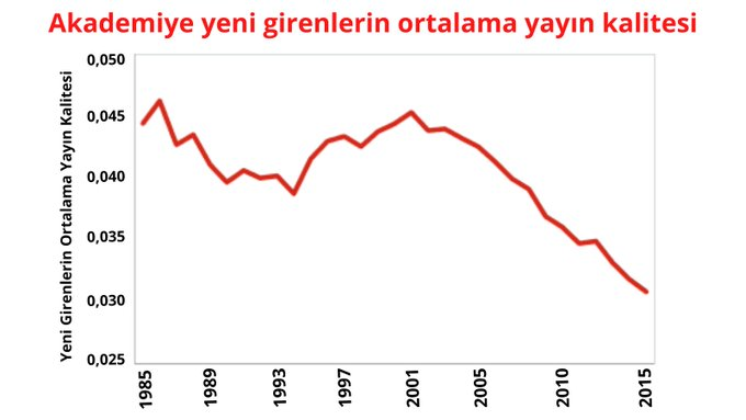 Türkiye Bilimler Akademisi'nin (TÜBA) 2020 raporuna göre akademik hayata yeni başlayan araştırmacıların ortalama akademik yayın kalitesi 2003 yılından sonra sürekli olarak gerileme kaydediyor.