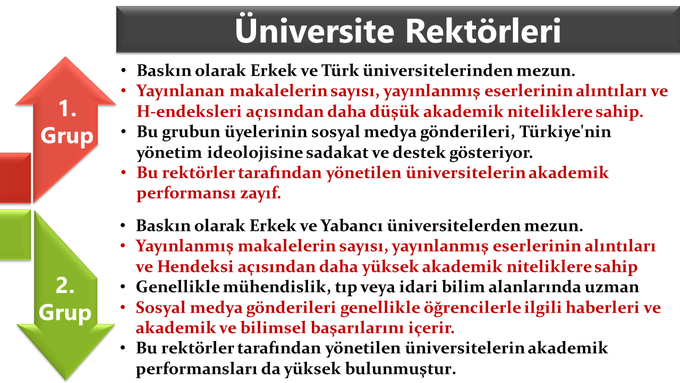 Prof. Engin Karadağ 2020 araştırmasında, Türkiye'deki 127 devlet ve 70 özel üniversiteyi yöneten rektörlerin iki gruba ayrılabileceğini iddia ediyor. Bu 2 grup sosyo-demografik özellikler, kariyer gelişimleri ve akademik yeterliliklerine göre şu şekilde kategorize ediliyor: