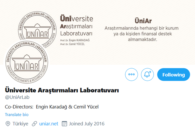 Yukarıda atıfta bulunduğumuz 19 Mayıs 2020 tarihli Higher Education makalesinin de yazarı olan Engin Karadağ'ın Cemil Yücel ile beraber yönettiği Üniversite Araştırmaları Laboratuvarı'nın Twitter hesabı: