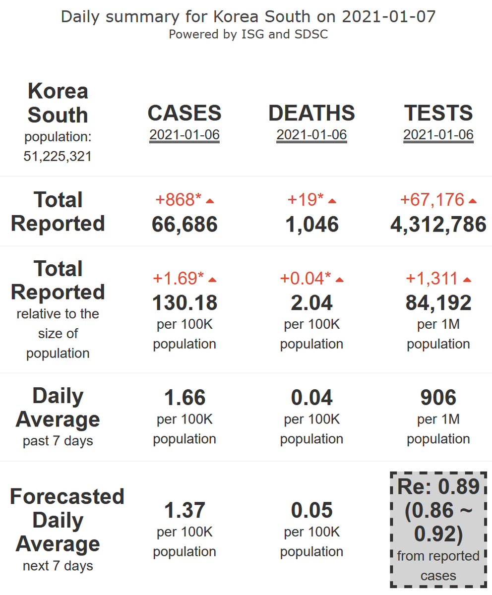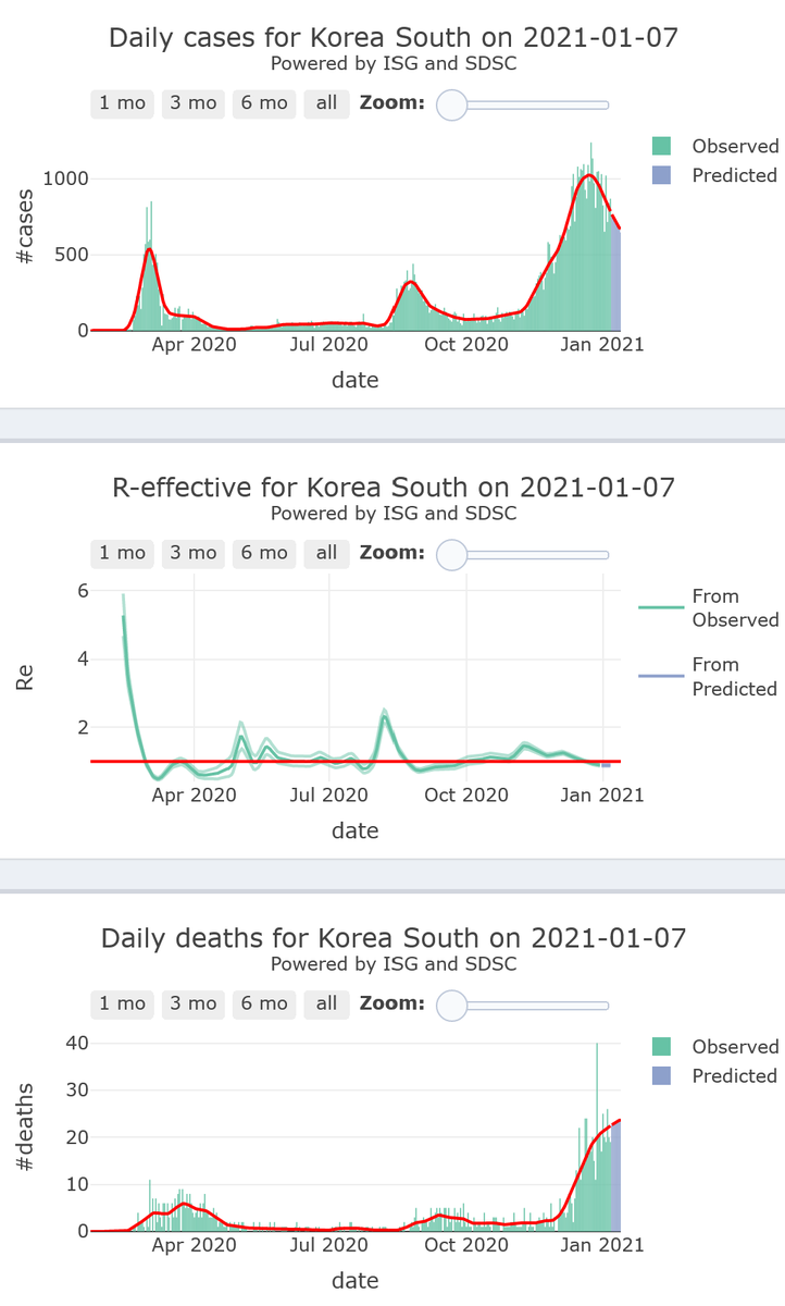 17/21. South Korea will remain in its #COVID19 safety zone (with <800 cases/day, R-eff=0.89), with very low levels of mortality, for 7 more days.