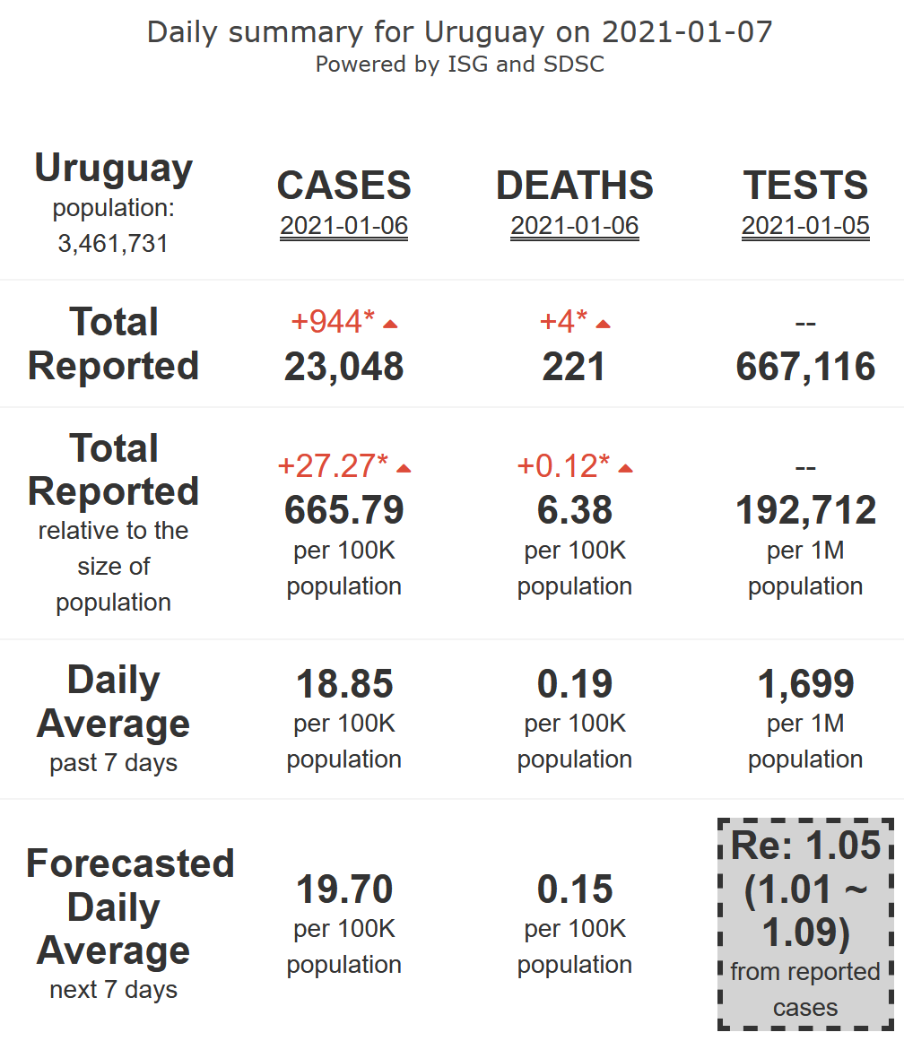 21/21. Uruguay is experiencing an increase in its #COVID19 epidemic activity (R-eff=1.05), at medium to high (by next mid-week) levels, with medium levels of mortality, for 7 more days.
