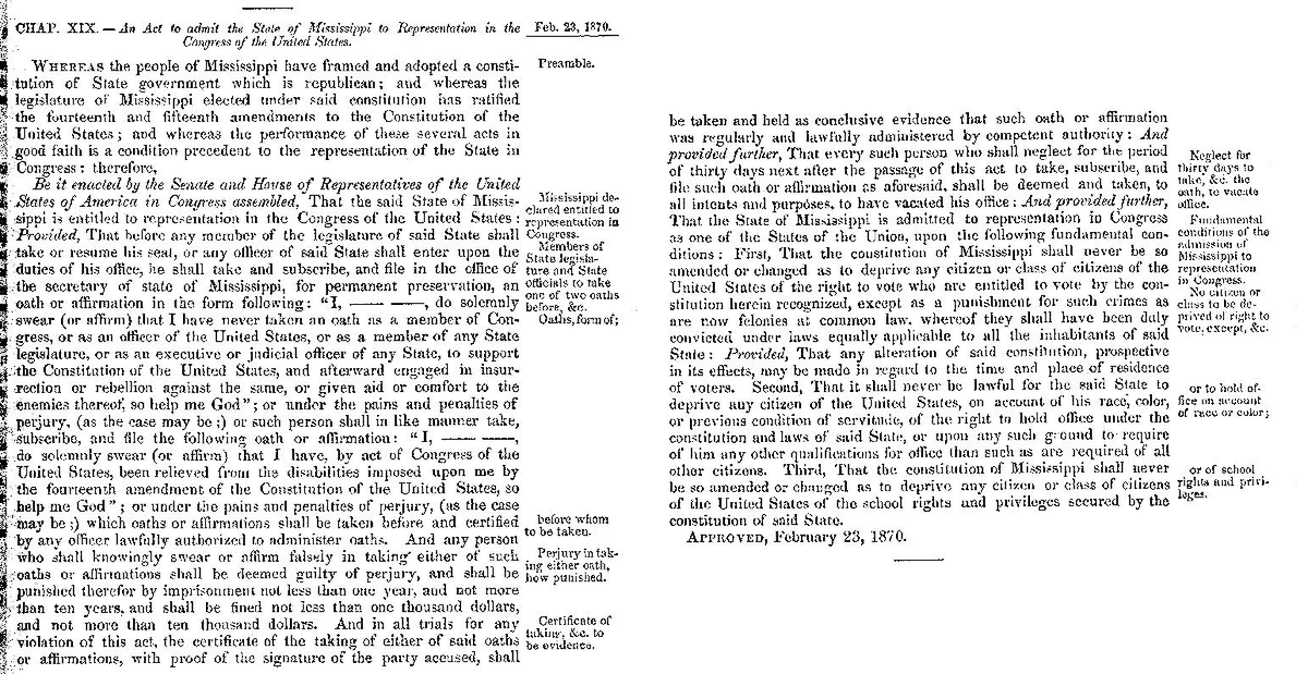 The federal law that SPLC wants to enforce is the MS Readmission Act (below), which is the act passed by Congress to readmit MS as a state after the Civil War—and which protects "the school rights and privileges" of MS children. 2/